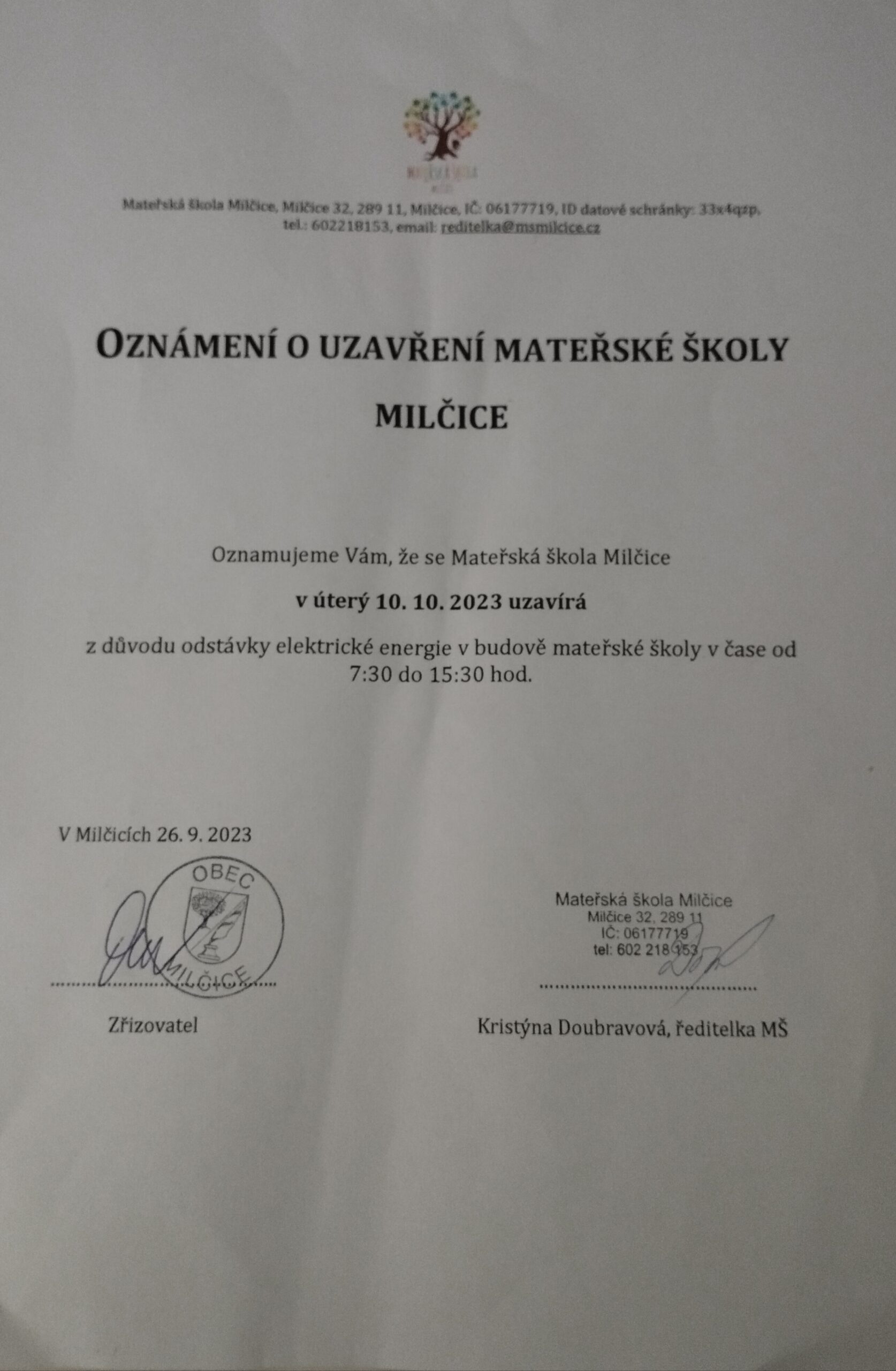 dne 10. 10.2023 bude mateřská škola po dohodě se zřizovatelem celý tento den uzavřena.