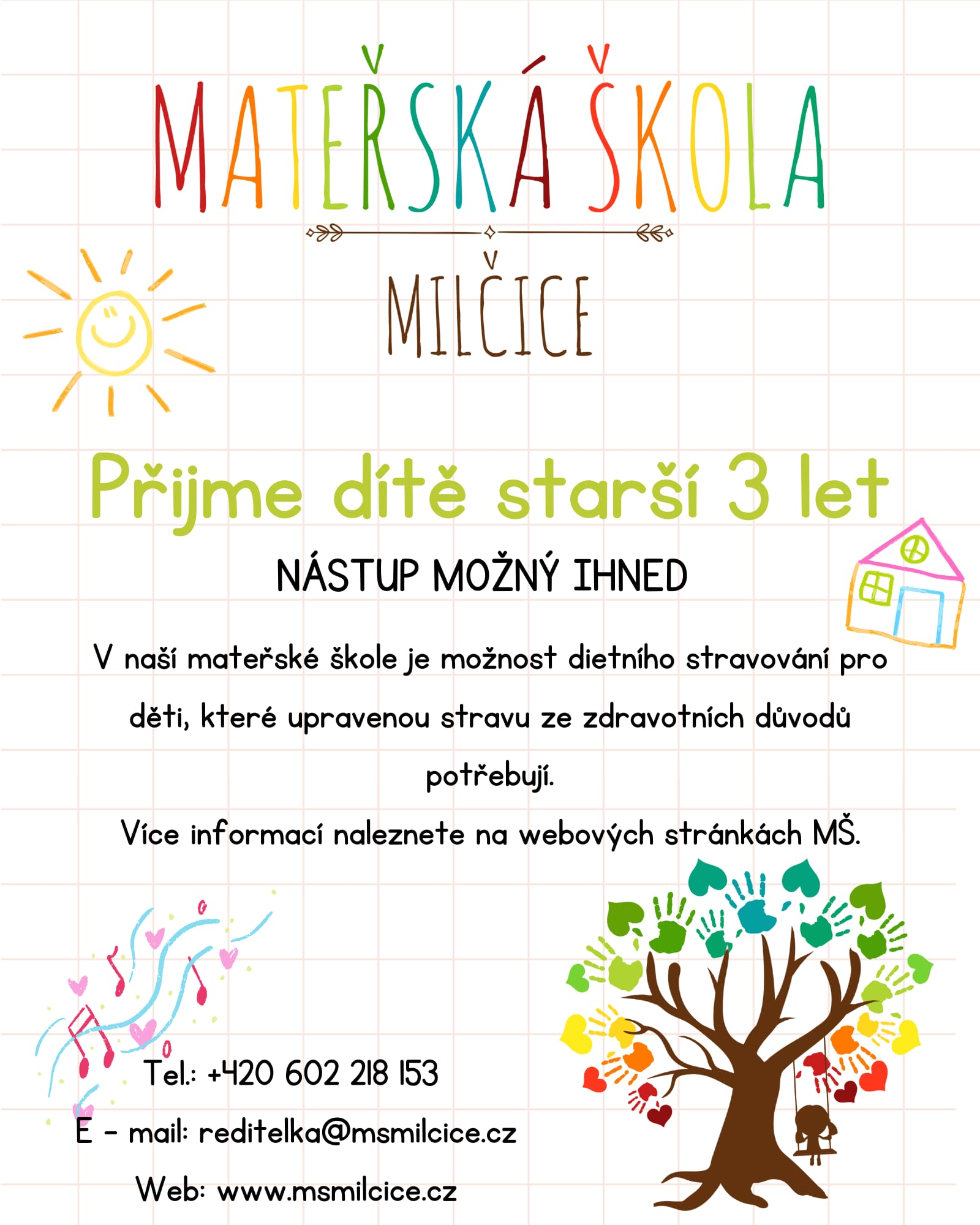 V mateřské škole se uvolnilo místo pro dítě starší tří let, s nástupem od září 2024. V případě zájmu volejte na telefonní číslo 602 218 153, případně využijte emailovou adresu reditelka@msmilcice.cz.